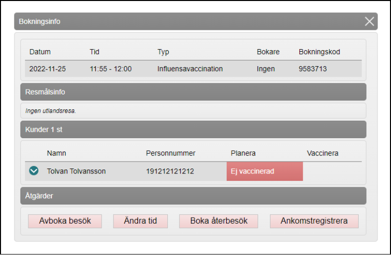 - Klicka på den bokning du vill öppna. Rutan Bokningsinfo öppnas. Härifrån kan du ordinera (klicka på Starta vaccination), gå till patientens journal (klicka på patientens namn) eller ändra och avboka patientens bokade tid.