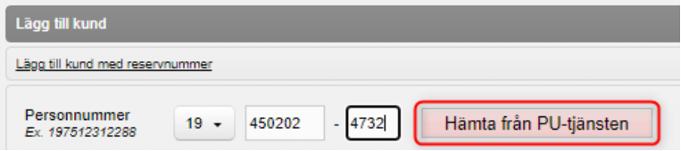Du kan även komma till Lägg till ny kund via menyn till vänster. - I Lägg till ny kund, ange patientens personnummer. Går du via knappen Lägg till kund i Sök kund är personnumret förifyllt.