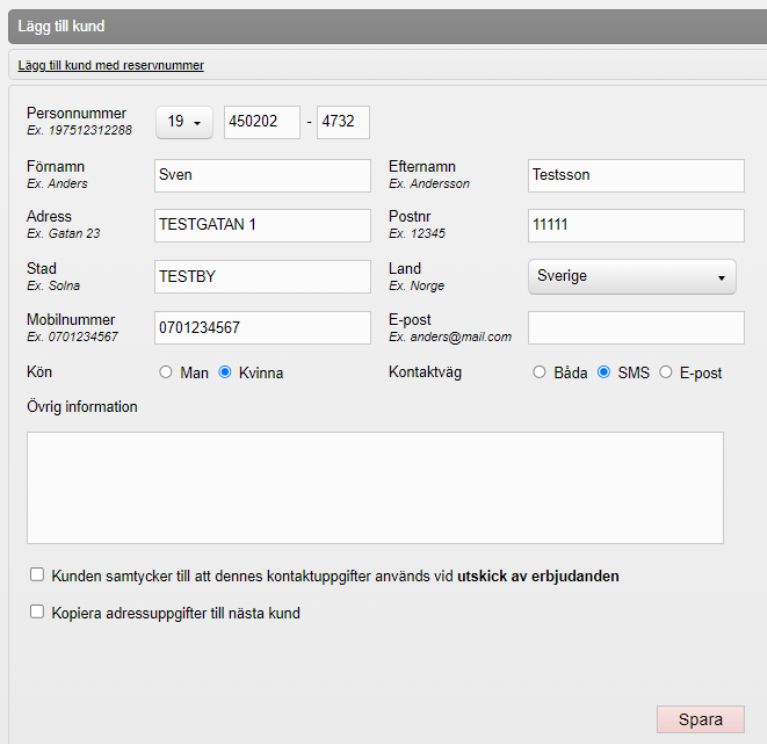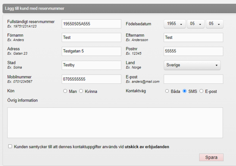 - Ange Förnamn, Efternamn, Adressuppgifter, ev Mobilnummer (går att lägga till utländska mobilnummer) och eventuellt om det finns någon annan viktig information.