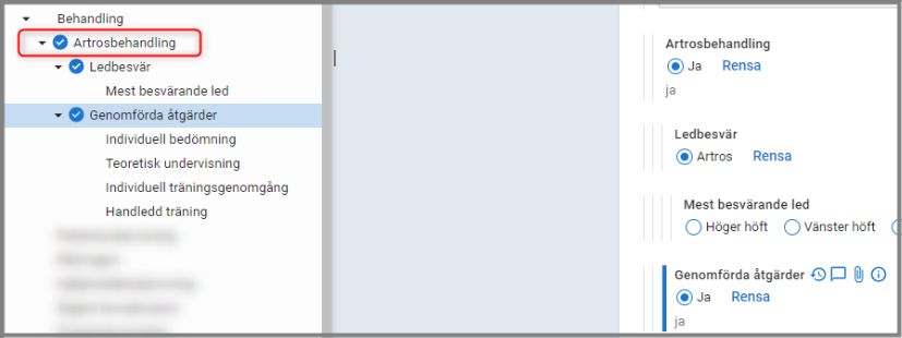 - Vid start av registrering välj Artrosbehandling och välj sedan Ja i vallista för att öppna undersökorden. Dokumentera på de sökord som ingår i formuläret Första besök, se Tabell 1.
