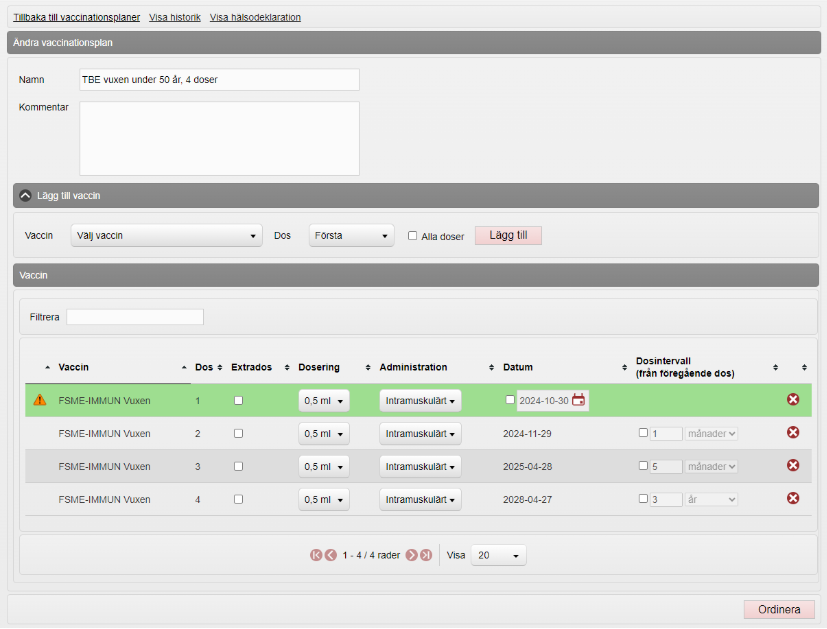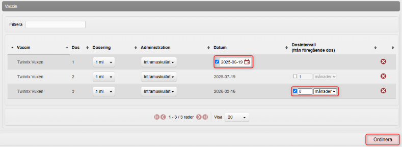 Klicka på Ordinera för att ordinera vaccinationsplanen.