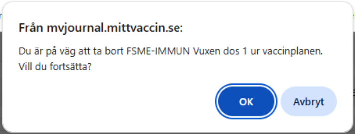 - Om du tagit bort någon/några doser från vaccinationsplanen får du upp en varningsruta. Klicka på OK om det är meningen att dessa doser ska tas bort. Klicka Avbryt om någon dos har tagits bort av misstag. Du får själv lägga tillbaka borttagna doser.