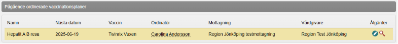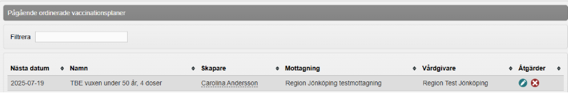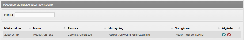 - Ordinerad vaccinationsplan finns nu under Pågående ordinerade vaccinationsplaner i vyn Vaccinationsplan. Om du vill göra ändringar i vaccinationsplanen klickar du på raden för att öppna vaccinationsplanen. Om du vill ta bort vaccinationsplanen klickar du på kryssikonen.