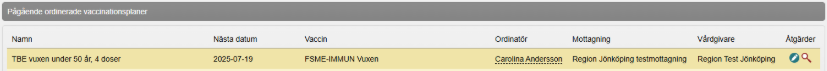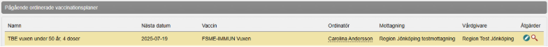 Du ser även ordinerad vaccinationsplan under Pågående ordinerade vaccinationsplaner i vyn Visa Kund. Om du vill göra ändringar i vaccinationsplanen, klicka på pennan. Klicka på förstoringsglaset för att titta på vaccinationsplanen.