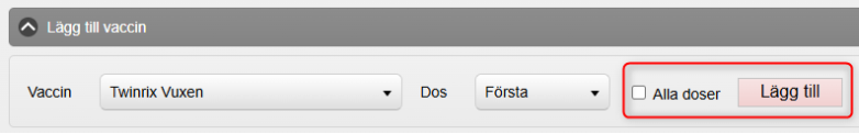 Lägga till vaccin/doser: Under Lägg till vaccin, välj vaccin och dos och klicka på Lägg till.