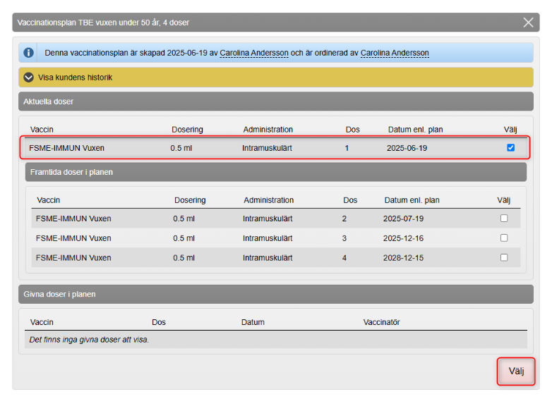 - Vaccinationsplanen öppnas där det/de vaccin som är aktuella enligt datum är förvalda. Här går det att bocka i eller ur om förvalda alternativ inte stämmer.