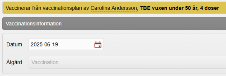 - Du kommer nu till vaccinationsflödet med åtgärd Vaccination. Under Vaccinationsinformation: Dagens datum är förvald, ändra datum om du efterregistrerar vaccinationen.