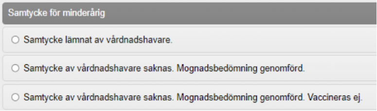 - Om patienten är minderårig måste du ange Samtycke för minderårig. Valen är olika beroende på barnets ålder. Markera aktuellt alternativ.