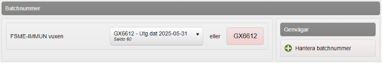 - Under Batchnummer: Välj batchnummer i vallistan. Ibland finns även en snabbknapp med tidigare använt batchnummer som du kan använda om det är rätt batchnummer som visas. Saknas aktuellt batchnummer i vallistan kan du lägga till det via Hantera batchnummer utan att behöva avbryta vaccinationen (se manual Hantera vaccin och vaccinsaldo/batchnummer).