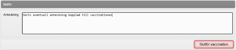 - Under Slutför: Skriv vid behov en anteckning kopplad till vaccinationen och klicka på Slutför vaccination för att slutföra registreringen.