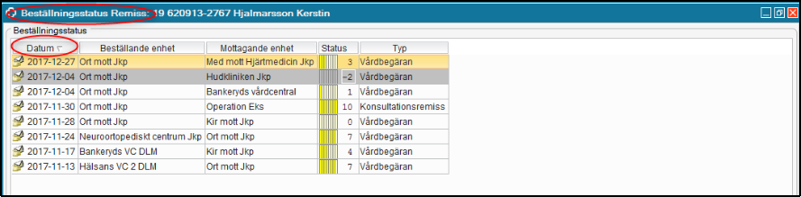 Beställande enhet och Mottagande enhet visas. En fullständig bild av patientens remisser default sorterade på Datum.