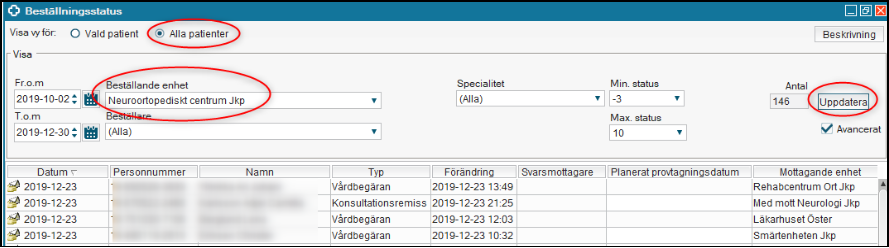 - Vill du söka på alla patienter får du välja en Beställande enhet.