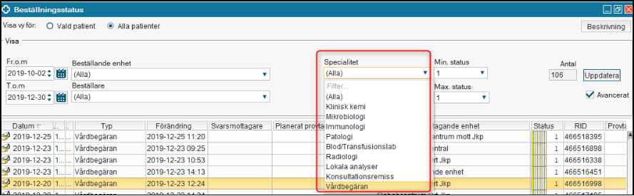 Du kan välja vilket eller vilka specifika status du vill se. Till exempel kan du se de remisser som är obedömda, med status 1. Du kan välja en Specialitet i taget.
