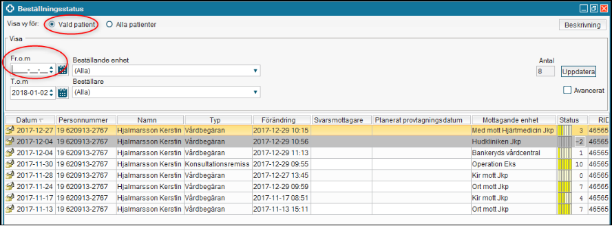 Beställningsstatus, endast remisser skickade för aktuell patient