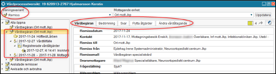 Du kan se remisshistorik, remisser (pågående, avslutade, avvisade och avbrutna), bedömningar, remissvar, remisstatus. Det går att avsluta remiss, återöppna remiss och vidarebefordra remisser (om enheten har öppnat för vidarebefordran). Det går också att ändra vårdåtagande på remissen och flytta åtgärder mellan remisser. Man kan även ändra Kategori 1 i Vårdprocessöversikten.