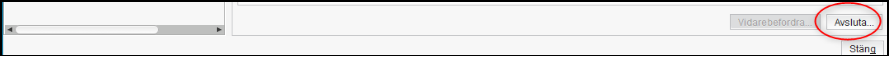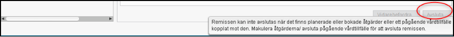 Finns inte knappen Avsluta eller den är nedgråad går inte remissen att avsluta på grund av t.ex. att det finnas planeringar på remissen eller den kanske inte är besvarad. Om muspekaren hålls över knappen Avsluta så kan man läsa i tooltip varför remissen inte går att avsluta.