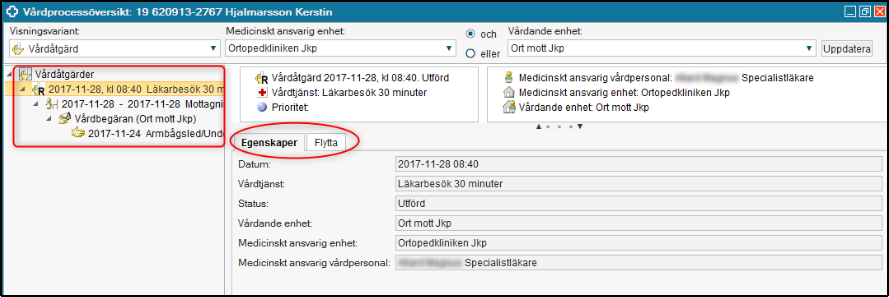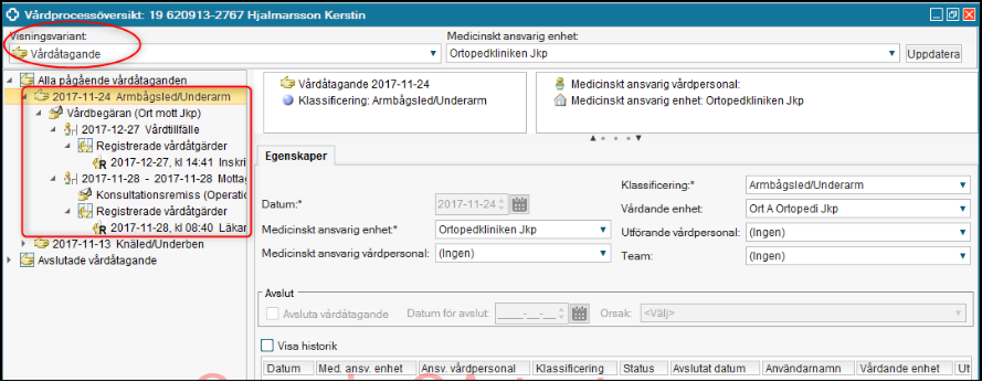 Vårdprocessöversikten är en översikt över patientens alla remisser, vårdåtaganden, vårdkontakter och vårdåtgärder. Visningsvariant Remiss visas default.