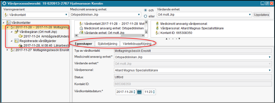 Visningsvariant Vårdkontakt – Visar i strukturen vårdkontakt, remiss som vårdkontakten är kopplad till, vilket vårdåtagande remissen har och vårdåtgärder kopplade till vårdkontakten.