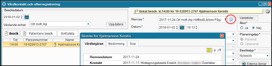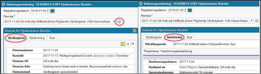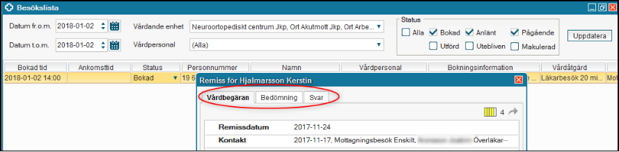 går det att få upp remissinformation om den specifika remissen som valts. Vilken typ av remiss det är, Vårdbegäran/Privat Vårdbegäran/Konsultationsremiss och/eller om remissen är bedömd, Bedömning, och/eller besvarad, Svar.