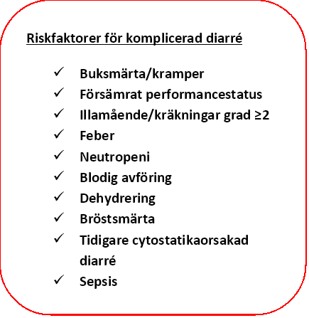 o Riskfaktorer: kvarvarande tumör, tidigare cytostatikaorsakad diarré, kvinnlig kön, DPD-brist.