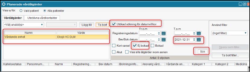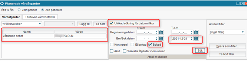 - Välj Datum långt fram i tiden. Själva datumet beror på hur långt framöver ni har bokade vårdåtgärder. Lägg till ytterligare tid som säkerhetsmarginal.