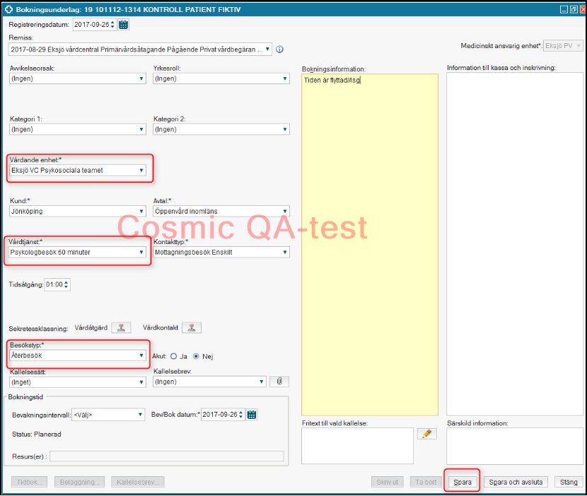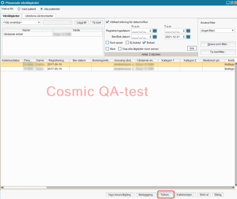 Patienten finns i Planerade vårdåtgärder på den nya enheten. - Om patienten erbjuds en ny tid direkt på den nya enheten, gå till tidboken via knappen Tidbok som aktiveras när man klickat på Spara.