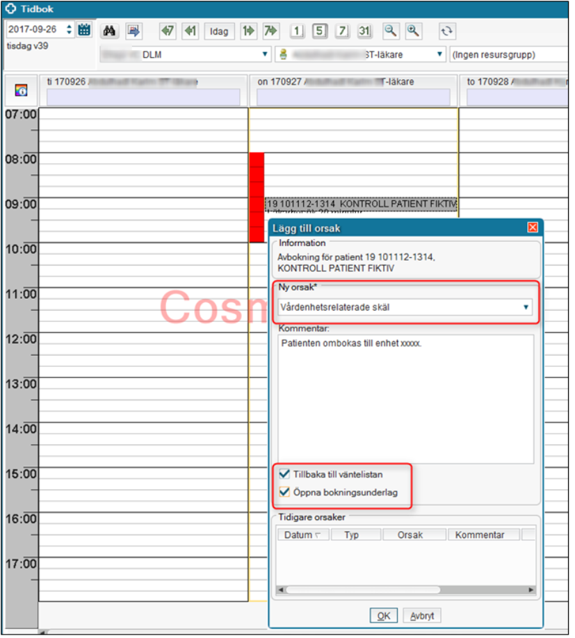 - Ange avbokningsorsak Vårdenhetsrelaterade skäl.
