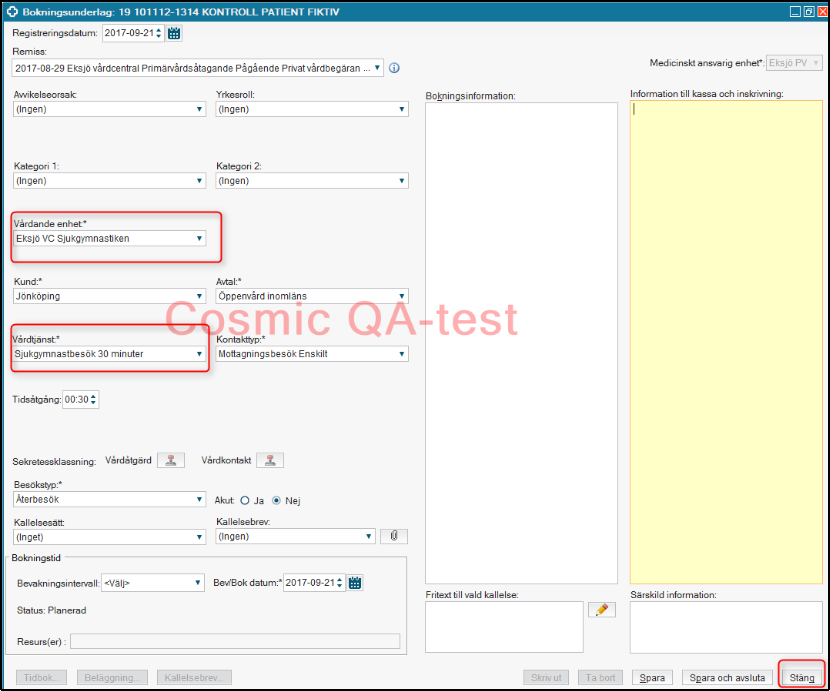 - Om patienten inte ska erbjudas en ny tid direkt, klicka på Stäng.