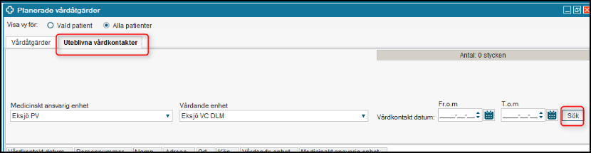- Välj fliken Uteblivna vårdkontakter i Planerade vårdåtgärder.