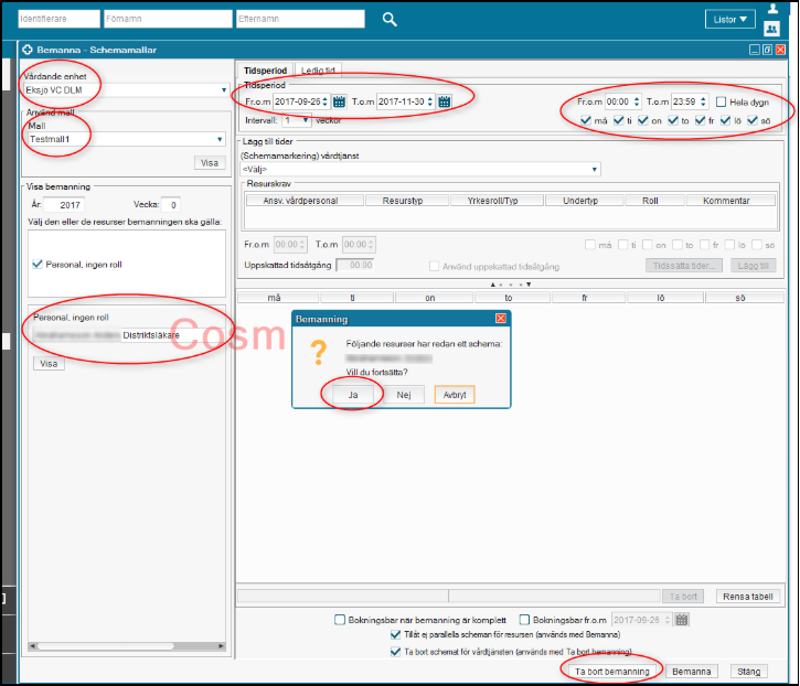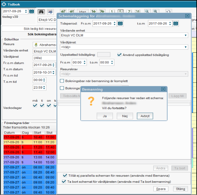 Har resursen schema även på andra enheter så måste man gå in och Ta bort bemanning enbart de dagar som schemat ligger på den vårdande enhet som ska tas bort.