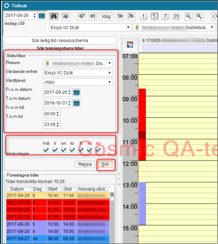 Viktigt att samtliga bokningar är borttagna från enheten innan detta moment görs då det är enbart bokningsbara lediga tider som ses i detta fönster.