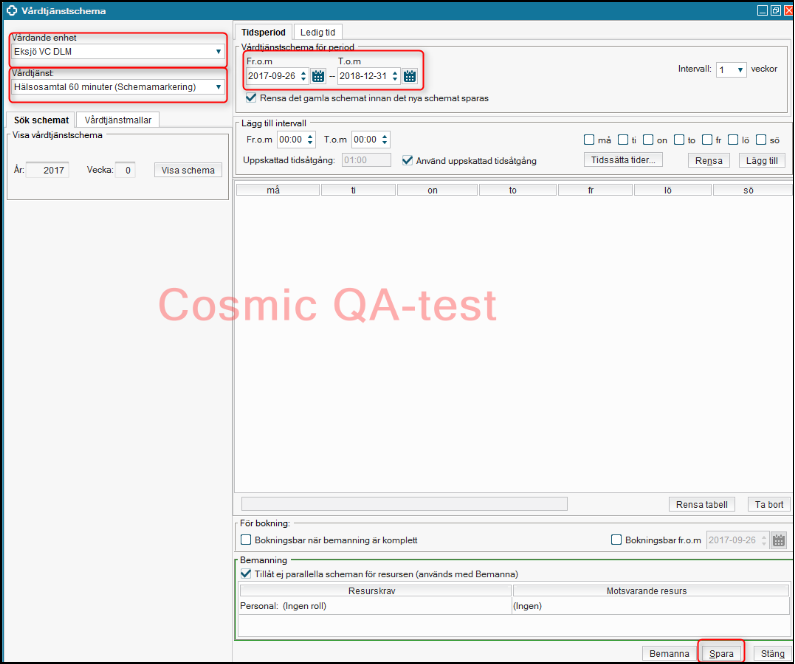 - Fyll i Tidsperiod och välj ett datum långt efter det egentligen ska finnas ett schema.