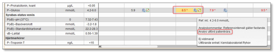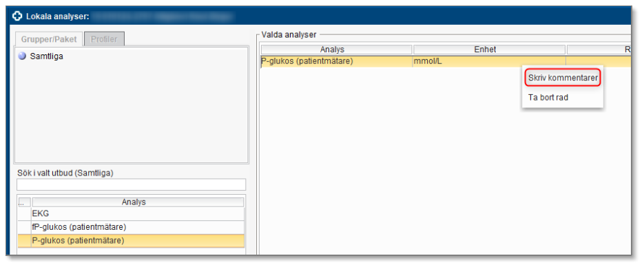 Om patientens P-Glukosmätare används ska värdet registreras som en lokal analys i Cosmic. Värdet registreras under analysen fP-glukos (patientmätare) alternativt P-glukos (patientmätare). Högerklicka på raden för den valda analysen för att ange i svarskommentaren om provet är taget som vävnadsprov eller kapillärt.
