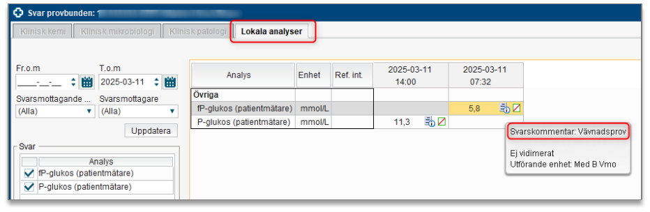 P-Glukosvärden från patientmätare hittas i fönstret Svar provbunden, flik Lokala analyser.