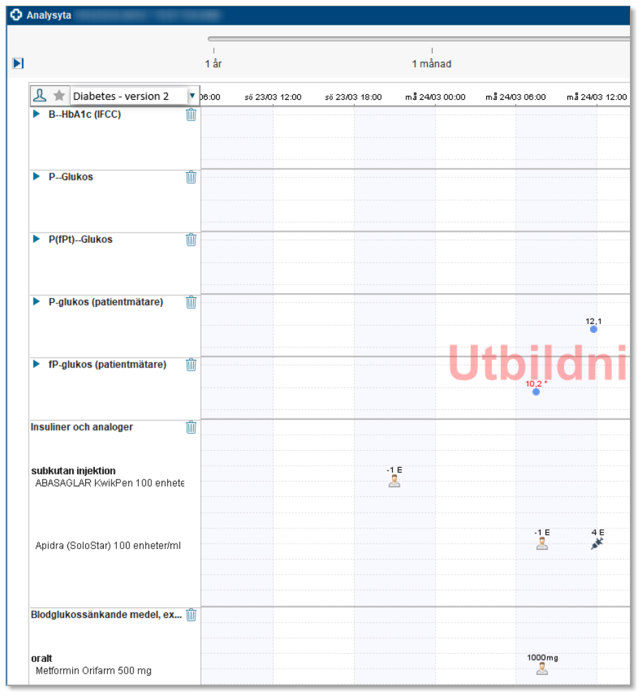 För att jämföra P-Glukosvärden mot administrerade diabetesläkemedel används mallen Diabetes - version 2 i fönstret Analysyta.