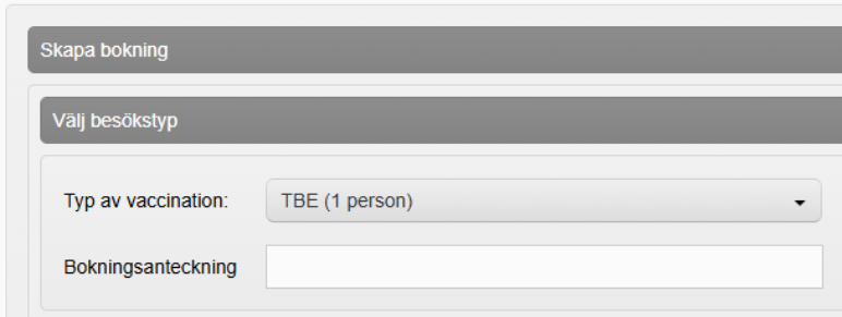Välj besökstyp i rullistan Typ av vaccination. I fältet Bokningsanteckning går det att skriva en anteckning som rör bokningen.