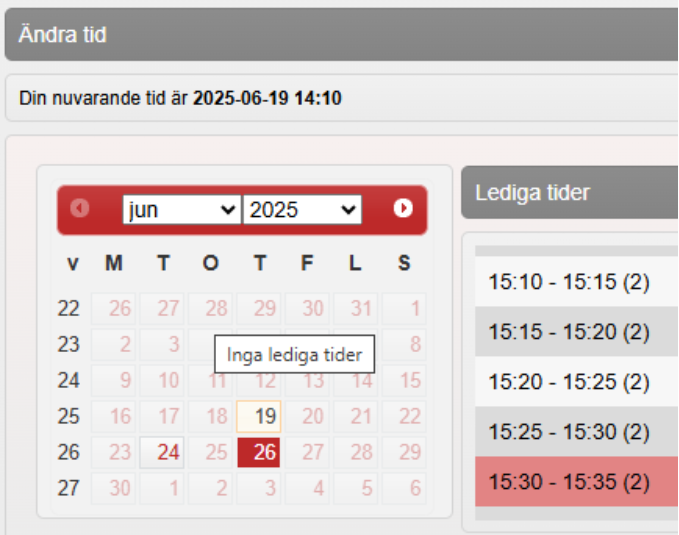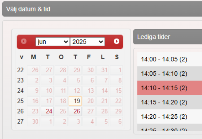 Välj datum genom att klicka i kalendern och välj en tid under Lediga tider. Vald tid blir rödmarkerad. Siffran inom parantes efter tiderna anger hur många resurser som är tillgängliga för bokning under aktuellt tidsintervall.