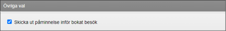 Patienten kan få en påminnelse om tiden via SMS eller e-post. Det är förvalt att skicka ut påminnelse om tiden men du kan enkelt bocka ur rutan under Övriga val om patienten inte vill ha en påminnelse.
