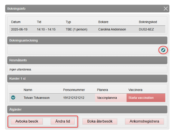 I rutan Bokningsinfo, klicka på Avboka besök eller Ändra tid. Genom att klicka på pennan vid Bokningsanteckning går det att ändra eller lägga till en bokningsanteckning.