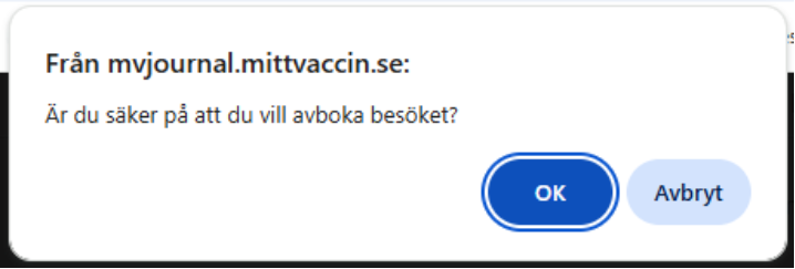 Om du väljer Avboka besök kommer en ruta upp. Klicka OK om du vill att besöket ska avbokas. Om du väljer Ändra tid, välj ett nytt datum och markera önskad tid. Klicka på Spara längst ner till höger.