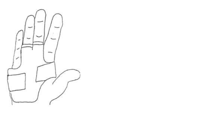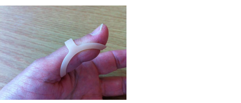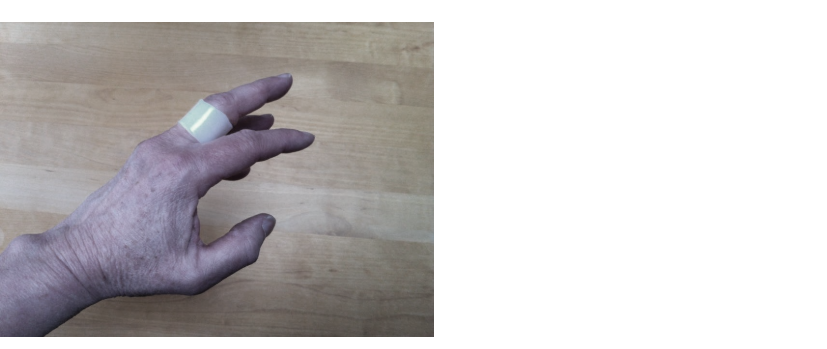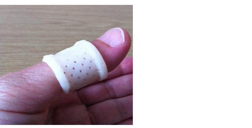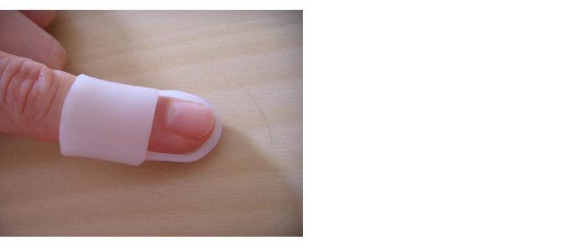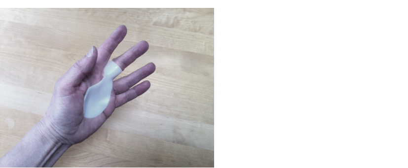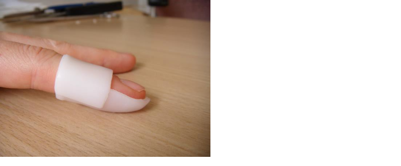 - Plasten formas med den rundade delen mot fingerblomman. Forma plasten runt fingret och fäst på andra sidan. Kan tejpas vid kanten mot PIP-leden vid behov.