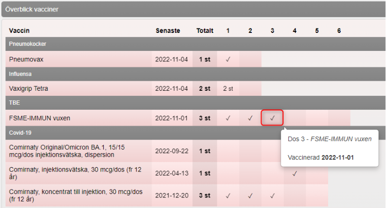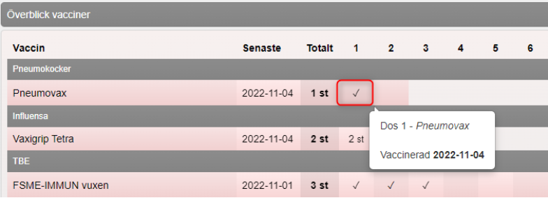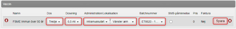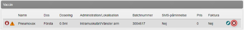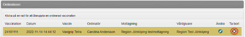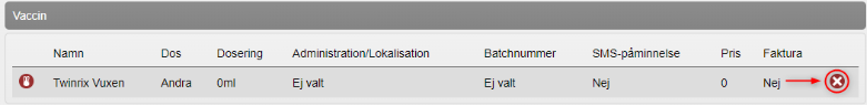 - Information om vaccinationen visas. Klicka på kryssikonen för att ta bort vaccinationen.