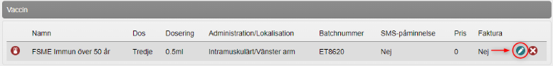 - Information om vaccinationen visas. Klicka du på pennan för att korrigera vaccinationen.
