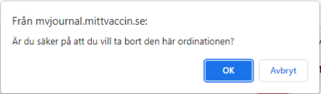 - En dialogruta visas med frågan: ”Är du säker på att du vill ta bort den här ordinationen?”. Klicka på OK för att bekräfta.
