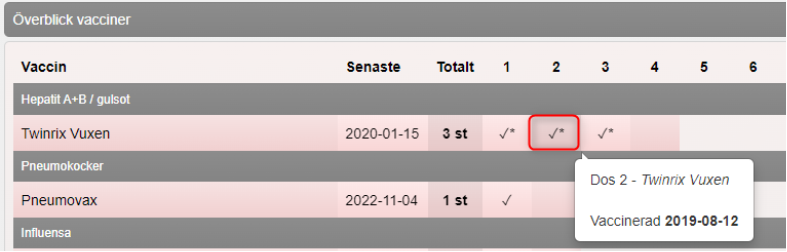 - Klicka på den dos som hör till den vaccinprodukt eller sjukdom du vill ta bort. Du ser att vaccinationen är registrerad som en tidigare vaccination genom att den är markerad med en asterisk (*).