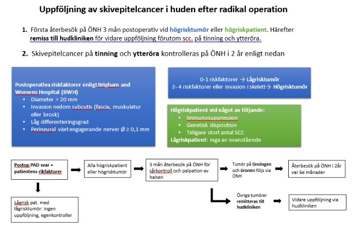 Alla högrisktumör eller högriskpatient följer man först 3 månader postoperativt för sårkontroll och palpation av halsen. Skickar sedan remiss till hud för fortsatta kontroller förutom skivepitelcancer på tinning och öron som fortsätter att kontrolleras på öron-, näs- och halskliniken i två år enl. nedan.