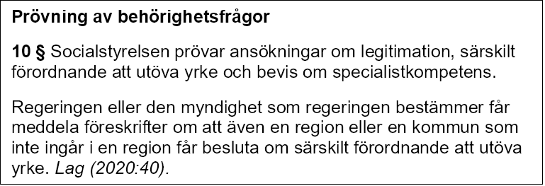 Från 2020-03-01 ändrade Patientsäkerhetslag (2010:659) så att Socialstyrelsen kan bemyndiga även regioner att få utfärda särskilda förordnanden att arbeta inom hälso- och sjukvård, se ruta nedan. Särskilda förordnanden kan utfärdas för tandläkare som är under utbildning efter fullgjord 9:e termin eller för 6-månaderspraktik för tandläkare med utländsk tandläkarlegitimation i syfte att få erhålla svensk legitimation.