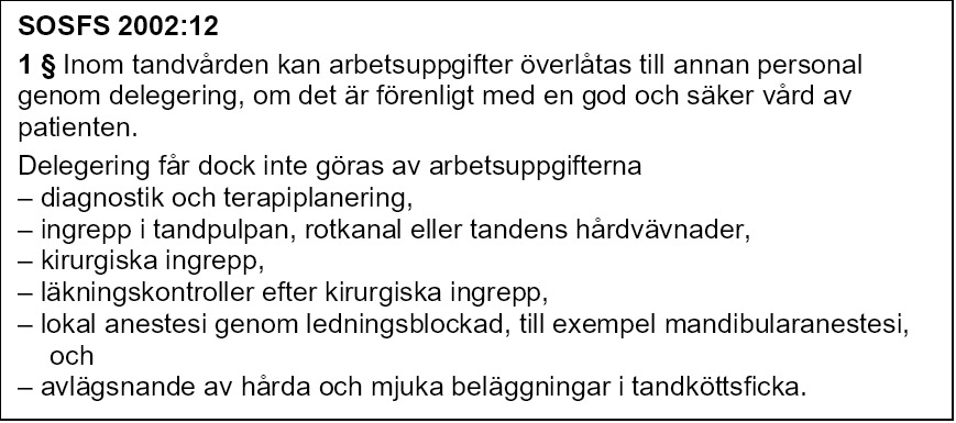 - Delegeringen får inte strida mot SOSFS 2002:12, till exempel inte avse diagnostik inom tandvård.