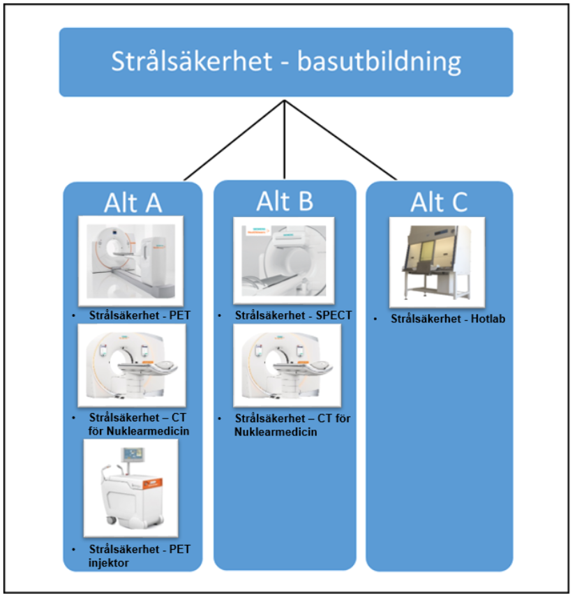 Alternativ B: Strålsäkerhetsutbildning – SPECT/CT riktar sig mot personal som arbetar med SPECT/CT-undersökningar. Utbildningspaketet omfattar grundläggande strålsäkerhet vid arbete med SPECT-respektive CT-undersökningar.