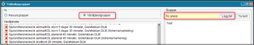 Markera vårdtjänstgrupper, skriv namnet på den nya gruppen och klicka på Lägg till